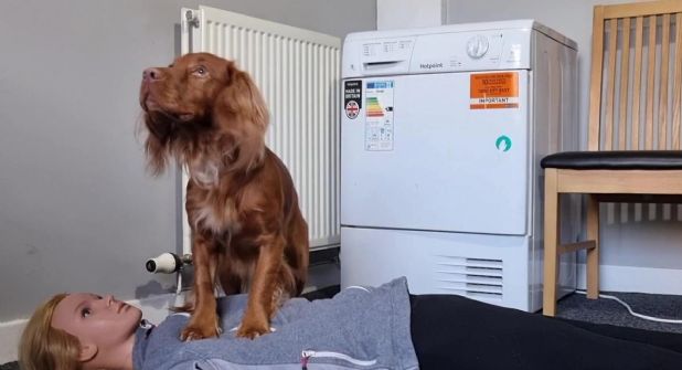 Un video muestra a Leo llevando un botiquín de primeros auxilios en miniatura en la boca antes de colocarlo suavemente junto a un maniquí boca abajo. Luego, Emily dice "nariz", lo que hace que el perro, de dos años, ponga su propia cabeza en los labios del muñeco y verifique si está "respirando". Después, Leo salta sobre el pecho del maniquí cinco veces, controlando su "aliento" y repitiendo el ciclo.