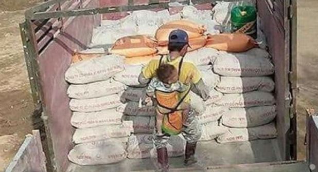 Las imágenes compartidas en redes sociales muestran a un hombre, quien lleva en sus espaldas a un pequeño, al que se le puede ver dormir mientras su padre trabaja arduamente en la obra.