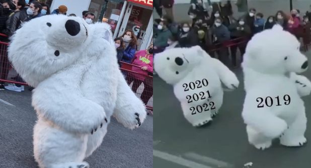 En este tipo de eventos es común que suelen pasar algunos desperfectos, en este caso una botarga de oso polar fue la protagonista de un pequeño accidente.