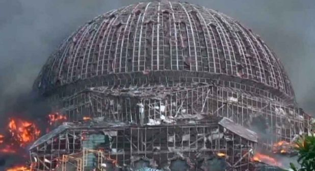 En las imágenes de la grabación se muestran las llamaradas junto a una enorme bola de humo gris que envolvía la cúpula, justo antes de que la misma se desplomara en cuestión de segundos.