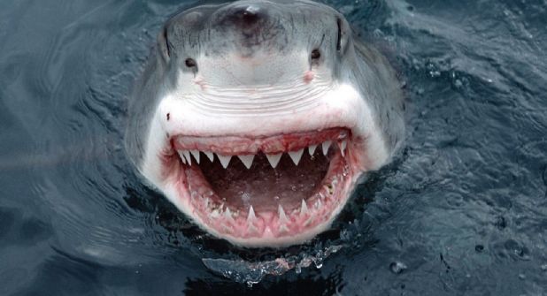 El tiburón abre la boca y se dirige hacia las piernas de la mujer, mientras ella regresa a la embarcación y levanta sus pies en los que tiene puestas las aletas de buceo.