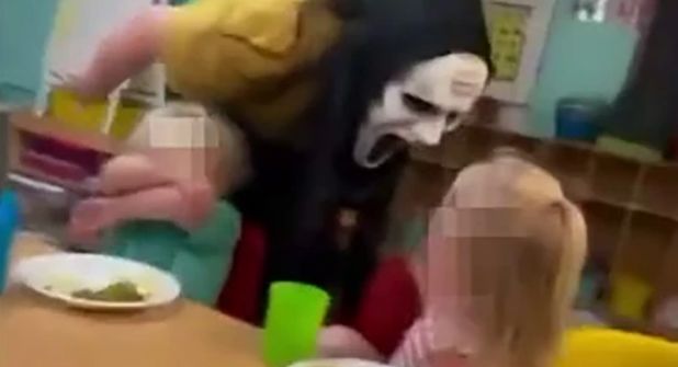 En las imágenes se ve cómo una de las trabajadoras entra al lugar en donde están comiendo niños y niñas, los niños primero se asombran, pues no saben de quién se trata. Al acercarse empieza el verdadero terror para los pequeños, quienes se encuentran aterrados.