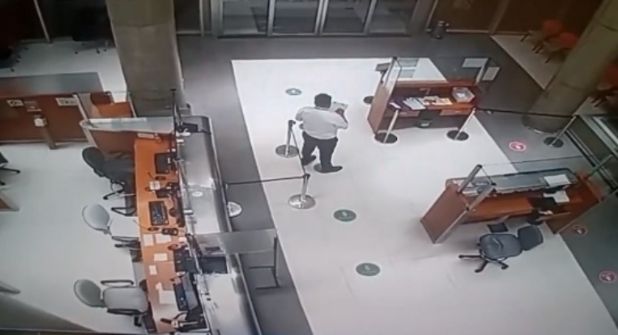 Luego el vigilante va en busca de una silla de ruedas que está en la parte trasera de la recepción, pero continúa platicando con la presencia que en el video no se aprecia, ya que no se ve que esté otra persona más, además del atento guardia de seguridad.