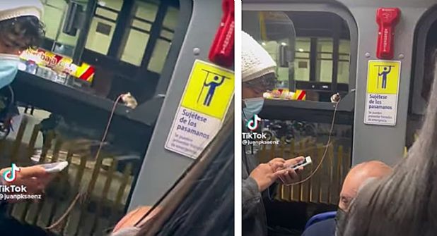 Esto no podía pasar desapercibido por los usuarios del transporte público de Bogotá, Colombia, pues no es muy común que un joven que viaje en camión con su mascota sea precisamente un ratón atado a un pequeño cordón de paseo.