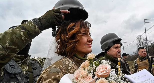 Darle el sí en medio de los bombardeos, mientras se casan en la línea de batalla fue un momento tierno que por instantes hizo olvidar los horrores de la guerra a los soldados presentes llenando de buenas vibras a los recién casados.