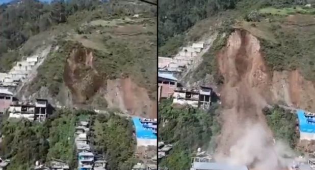 En redes sociales compartieron videos del momento en que un derrumbe en una ladera provocó un deslizamiento de tierra que dejó decenas de casas sepultadas.