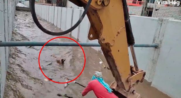 En el clip que se viralizó en las redes sociales, se ve cómo un obrero que se encontraba laborando en una obra cercana, sube a la cuchara de la excavadora y da instrucciones para que lo acerquen al agua del canal y así poder atrapar a la mascota que era arrastrada por la fuerte corriente.