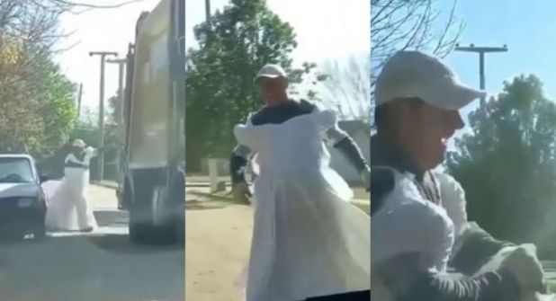 Sin duda hay muchas situaciones buenas diarias, las cuales sacan una sonrisa a las personas presentes en el momento. En este contexto fue captado un recolector de basura, quien trabajó con un vestido de novia puesto.