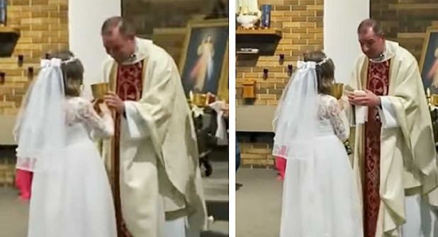 La pequeña, vestida con un vestido de encaje, resopló durante unos 10 segundos mientras los feligreses se reían, el sacerdote parecía desconcertado y su madre filmaba.