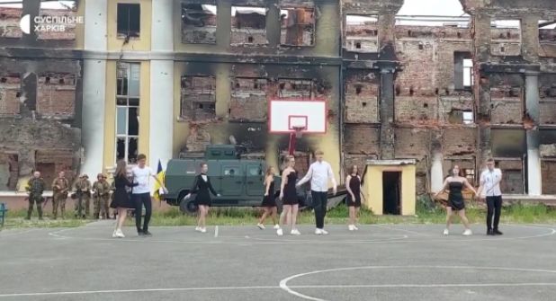 Un video muestra como los alumnos de la escuela número 134 en Ucrania bailan su vals de graduación frente a las ruinas de lo que fue su centro educativo, justamente en la cancha de basquetbol del lugar.