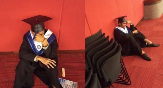 Al percatarse de que sus padres no asistieron a presenciar el momento, las lagrimas comenzaron a surgir de los ojos del joven, quien ante la situación decidió sentarse en una de las equinas del auditorio a tratar de contener el llanto.