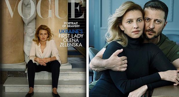 Vogue también ha publicado la imagen de la Sra. Zelenska como su última estrella de portada digital, llamándola "retrato de valentía", en la que la Primera Dama de Ucrania está sentada dentro de la oficina presidencial y vestida informalmente con pantalones negros y blusa blanca.
