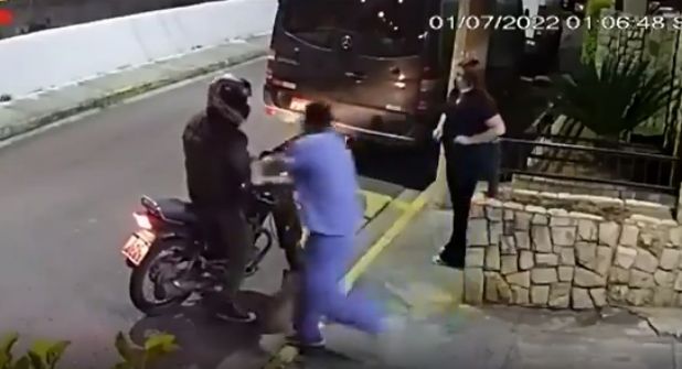 Los hechos fueron registrados el pasado 1 de julio en Brasil, donde las cámaras de seguridad captaron el momento justo donde un ladrón, sobre una motocicleta, interrumpe la plática de los dos colegas médicos para amenazarlos con un arma de fuego y pidiendo sus objetos de valor.