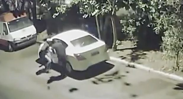 En las imágenes se aprecia cómo se dirigían a quienes estaban dentro del sedán. Los hombres logran su objetivo y consiguen abrir ambas puertas de manera simultánea.