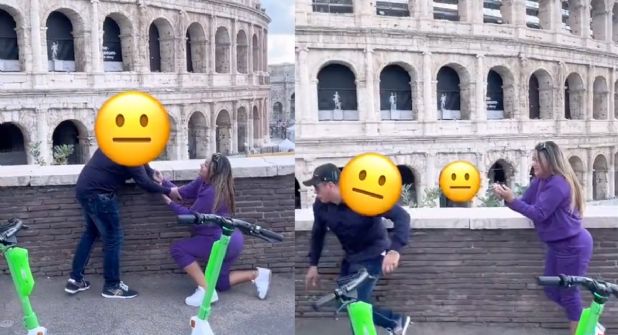 El video capta el momento en que una pareja observa el monumento histórico del Coliseo Romano mientras el hombre observa el paisaje, la chica aprovecha para hincarse mientras sostiene el anillo de compromiso, un gesto que parece no agradarle al novio, pues de manera rápida intenta que la chica se ponga de pie.