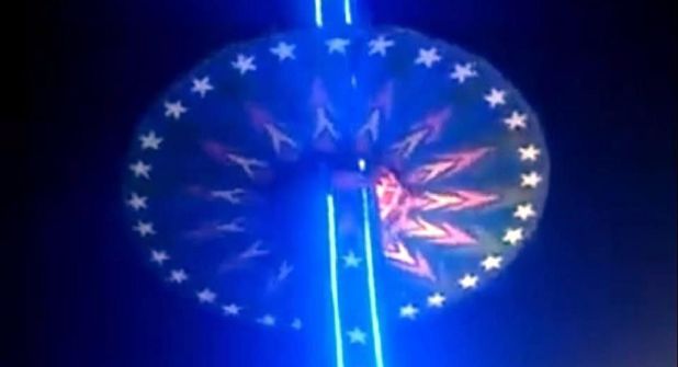 El reportero compartió en su cuenta de Twitter, un video donde se muestra el momento en que la rueda giratoria del juego, sube y luego comienza a descender, pero no frena, como usualmente lo haría y termina por estamparse contra la base de la estructura, haciendo que varias personas que se encontraban en la atracción, salieran por los aires.