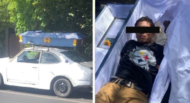 Lamentablemente para él, la Policía Nacional había puesto un dispositivo de control vehicular, donde los elementos de seguridad pidieron al conductor abrir el ataúd, el cual estaba atado en la parte superior del auto particular.
