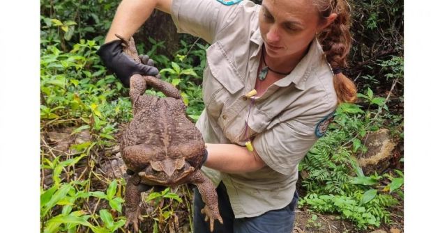 El anfibio es conocido como sapo de caña, el cual logró ser avistado por los protectores del Parque Nacional Conway gracias a una serpiente interpuesta en el camino.