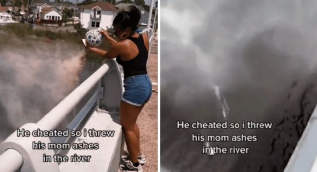A través de un video compartido en Tik Tok, y donde lamentablemente ya no puede ser encontrado, se observa a la esposa dolida agarrar la urna funeraria de la madre de su pareja, abriendo el envase para dejar ir su contenido en el lago Worth, del condado de Tarrant. Tal fue la rabia de la traición que lanzó la vasija, dejando que esta fuera llevada por la corriente del cuerpo de agua.
