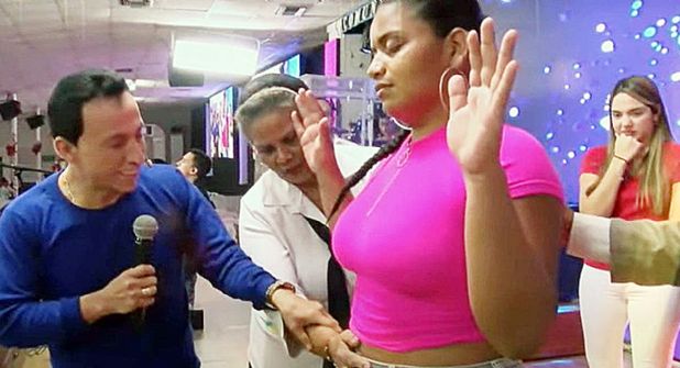 Mientras el pastor señala a la joven, le pide a otra mujer que la ayude con su pedido de bajar de peso. La voluntaria levanta las manos y pide con fe, mientras realizan un ritual.