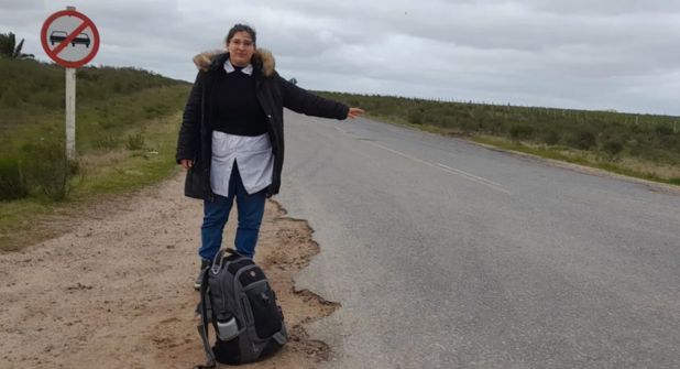 Son las 8:00 apenas, una helada mañana de invierno y María Domínguez, de 29 años, está en la entrada de una pequeña ciudad de Florida, 90 kilómetros al norte de Montevideo, intentando que un conductor se detenga y le ofrezca llevarla.