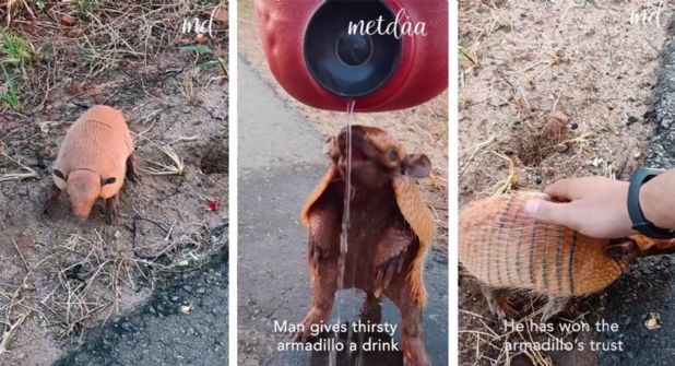 Fue un gesto realmente conmovedor. El motociclista detuvo su vehículo y, sin pensarlo dos veces, sacó un recipiente con agua que tenía en su vehículo y se acercó con cuidado al armadillo.