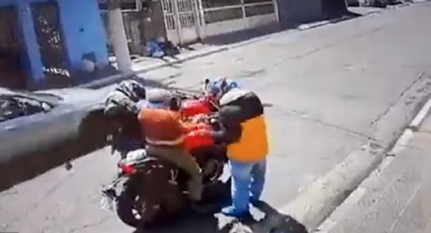 En un video que circula en redes sociales queda grabado el momento que dos ladrones roban moto a abuelito, inmediatamente después de cometer el atraco, uno de ellos cae y muere.