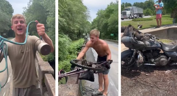 En lugar de atrapar peces, el audaz hombre ha estado sacando del agua objetos tan variados como armas, bicicletas, motocicletas e incluso un carrito de golf.