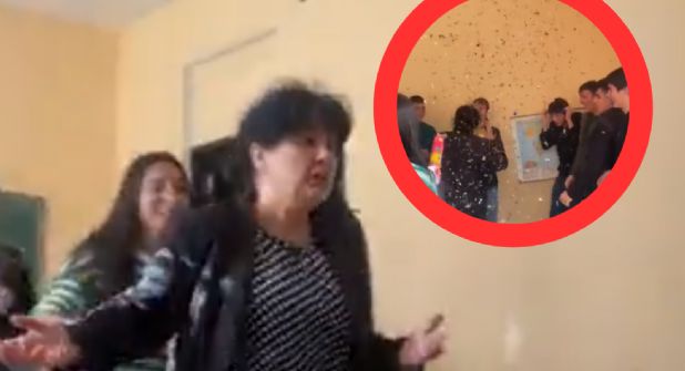 Un grupo de alumnos, al parecer de secundaria, simularon una pelea al fondo de un salón de clases. Entre el bullicio por la supuesta discusión, una maestra entra al aula y se percata de que hay una situación en la que alumnos presuntamente se están golpeando.