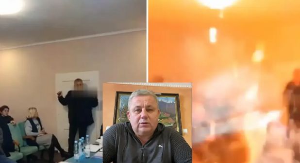 En las imágenes se observa al parlamentario ucraniano, quien había acudido a un pleno de su municipio, entrando y cerrando la puerta detrás suyo. De sus ropas, completamente negras, saca dos granadas que sostiene, mientras las demás personas discuten temas que atienen a todos por igual.