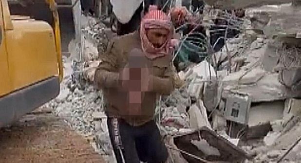 Las imágenes muestran a un hombre que sale corriendo del interior de un edificio de cuatro pisos derrumbado en Siria con una diminuta recién nacida cubierta de polvo.