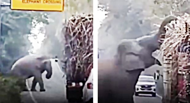 El conductor se ve obligado a frenar porque el elefante ocupa todo el ancho del carril del camino. Después de que el camionero detiene su vehículo, el paquidermo revisa la carga y de manera habilidosa, con su trompa sustrae las cañas de la caja trasera del camión y las deposita a una orilla del asfalto.