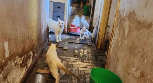 En el allanamiento se hallaron 23 felinos (en su mayoría blancos), los que fueron inmediatamente analizados por los veterinarios, quienes determinaron el flagrante maltrato animal sumado a numerosas deficiencias higiénicas y riesgos zoonóticos presentes en el lugar recomendando su inmediato rescate.