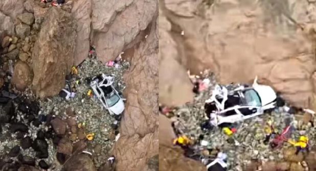 El accidente se produjo porque golpearon el tramo de protección en la curva y el auto dio giros y comenzó a caer hacia el acantilado, pues la valla que protegía a los autos se había roto.