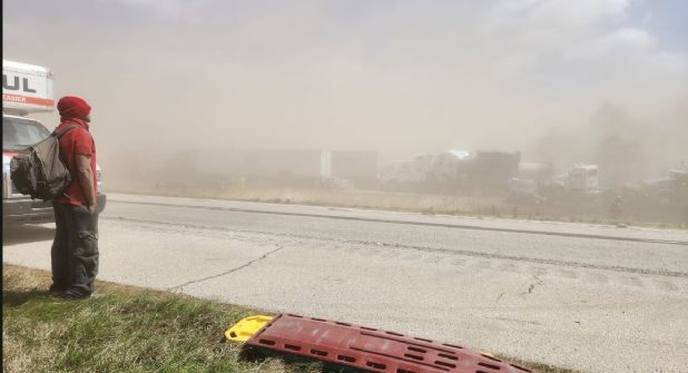 Una tormenta de polvo ocasionada por vientos excesivos que soplaron tierra desde campos agrícolas a través de la autopista, resultando en una visibilidad cero, causaron un múltiple accidente de vehículos y tráileres con el saldo de seis muertos y más de 30 heridos.