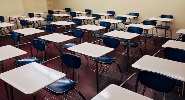 En las imágenes se ve una jovencita sentada al frente de una de las filas, uno de los estudiantes voltea a verla y su rostro se torna molesto.