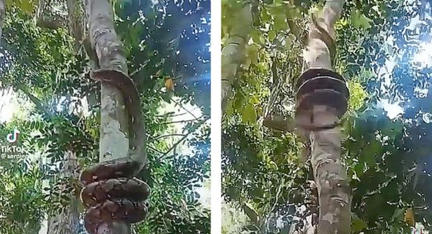 De esta manera, la descomunal anaconda que fue captada al trepar un árbol ha causado una conmoción entre los internautas que ven y comparten el curioso video.