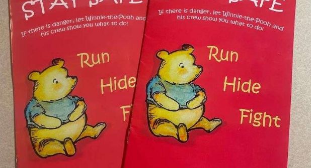 Las tres palabras que se observan plenamente dentro de la portada del libro son simplemente aterradoras, "Corre, escóndete y pelea"; tratando de decir que los niños del Distrito Escolar en Texas tendrán esas tres opciones cuando se presente el peligro en sus escuelas.