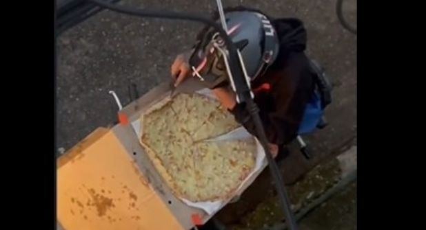 La mujer identificada como Susy Jiménez grabó desde su ventana al repartidor, devorando con ansiedad una rebanada de una pizza que tenía que entregar a un cliente.