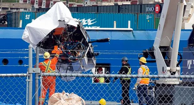 Grandes piezas de metal que se asemejan a partes del casco blanco y los patines de aterrizaje del Titán, diseñados para aterrizar en el lecho marino, llegaron a St John's el miércoles, a través del Horizon Arctic, un barco de bandera canadiense.