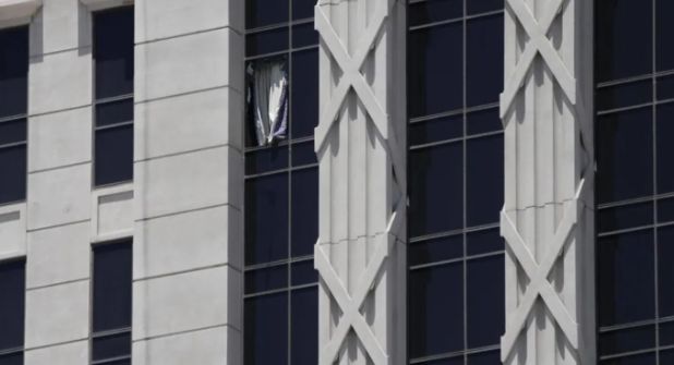 En el video se logra apreciar como alguien hasta ahora desconocido empieza a arrojar objetos por una ventana rota del Caesars Palace, precipitándose hacia el suelo.