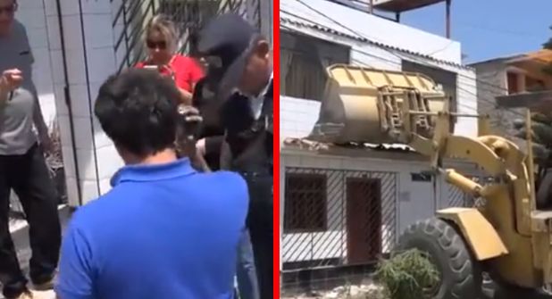 Posteriormente, para retirarlo completamente, llaman a una retroexcavadora, la cual usa sus enormes palas para hacer caer los castillos de la construcción ilegal.