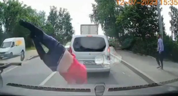 Pero cuando el tipo de rojo intenta cruzar la calle de pronto es arrollado y, por el impacto, mandado a volar contra un vehículo estacionado al otro lado del camino; tras lo ocurrido el atropellado es orillado a un costado de la calle por su acompañante.