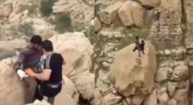 Un usuario de Twitter compartió un video en el que dos hombres toman la decisión de lanzarse de una tirolesa ante un fondo rocoso.