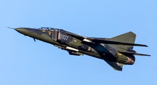 El aparato ha estado en el circuito de exhibiciones aéreas este año y ha deleitado a los fanáticos. Estos aviones de combate complejos de la era soviética en forma de vuelo son una rareza.
