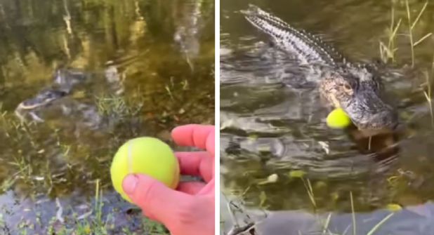 Sin embargo, por lo visto, esto no es exclusivo para los perros, ya que en TikTok el usuario @destiny4271 compartió el video en el que aparecen una pelota de tenis, un caimán, un hombre y una laguna.