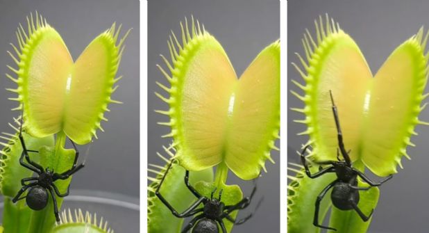La planta carnívora abre de manera "amistosa" sus hojas para recibir al visitante, a lo que el arácnido reacciona favorablemente.