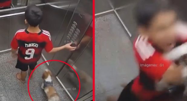 Las imágenes, captadas por una cámara de seguridad, muestran al menor y al perrito entrando al elevador. Se logra distinguir que el animal venía con una correa, la cual está tirada en el suelo sin aparente supervisión del niño, quien solo entra al ver a lado a su mascota.