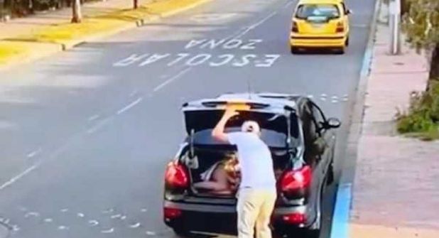 Mientras la mujer y el hombre discuten, la joven sigue oculta en la parte opuesta del carro, hasta que termina metiéndose en la cajuela.
