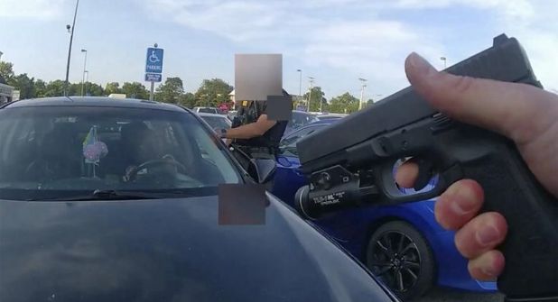 Por lo anterior, el policía que se encuentra frente a la mujer embarazada, dispara contra el parabrisas y, segundos después, el auto tipo sedán se desvía hasta chocar contra un muro en la tienda de conveniencia.